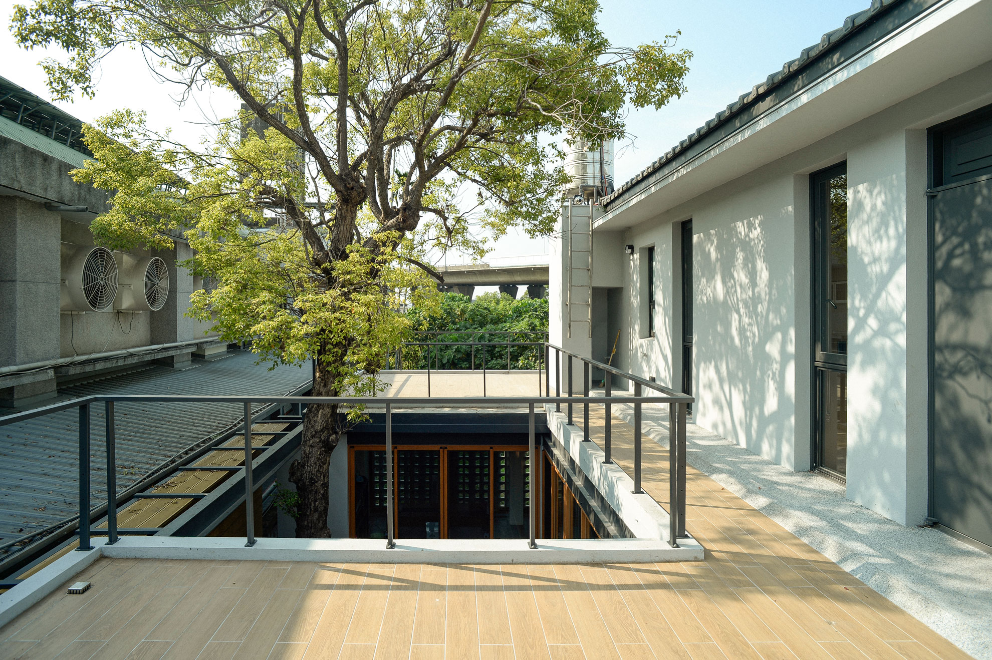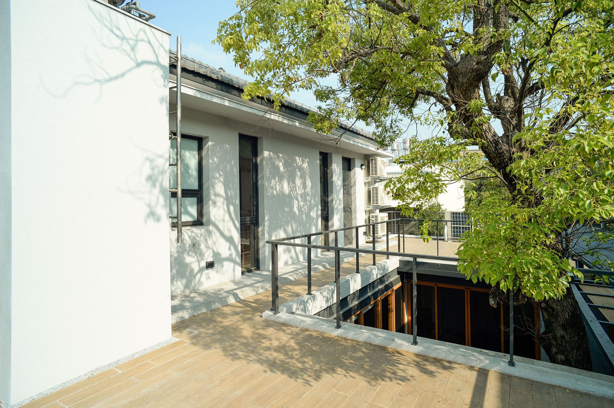 The original house’s pitched roof and balconied front facade immediately set it apart from typical Taiwanese townhouses. In our redesign, we preserved this distinctive front profile, focusing major expansion and remodeling efforts on the back of the house. The ground floor was expanded to include two symmetrical rooms that enclose a serene garden, with an existing tree standing at the corner.